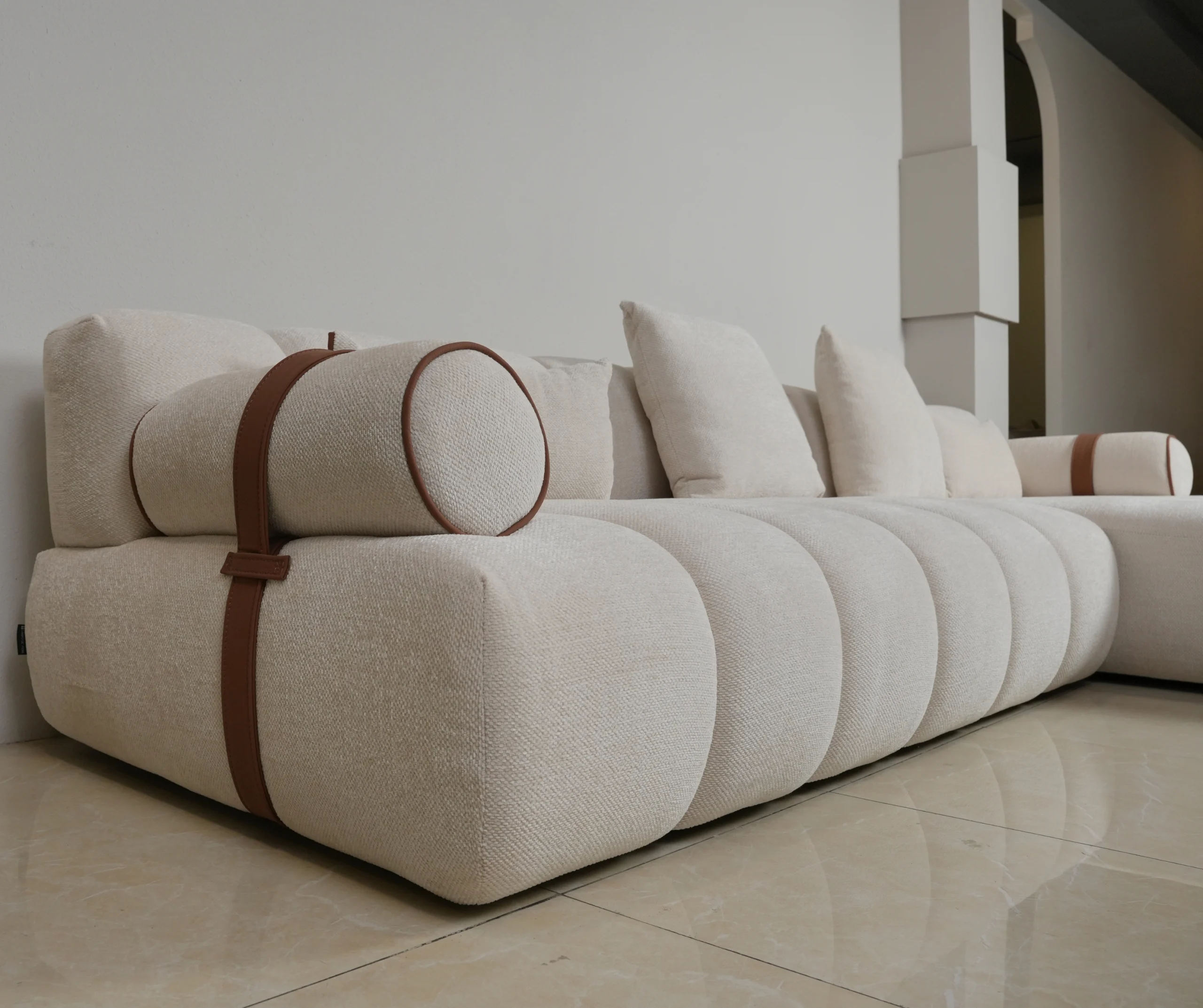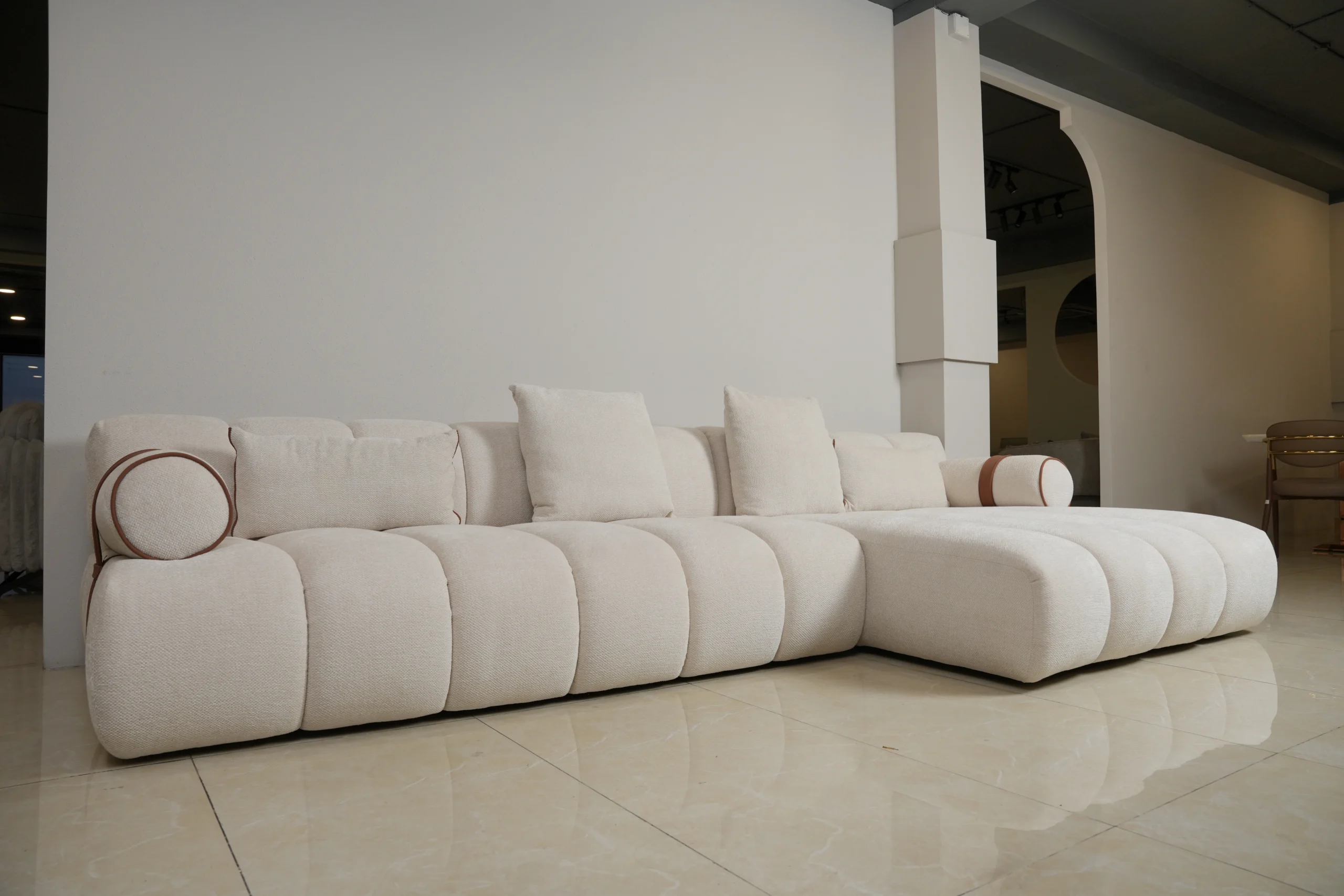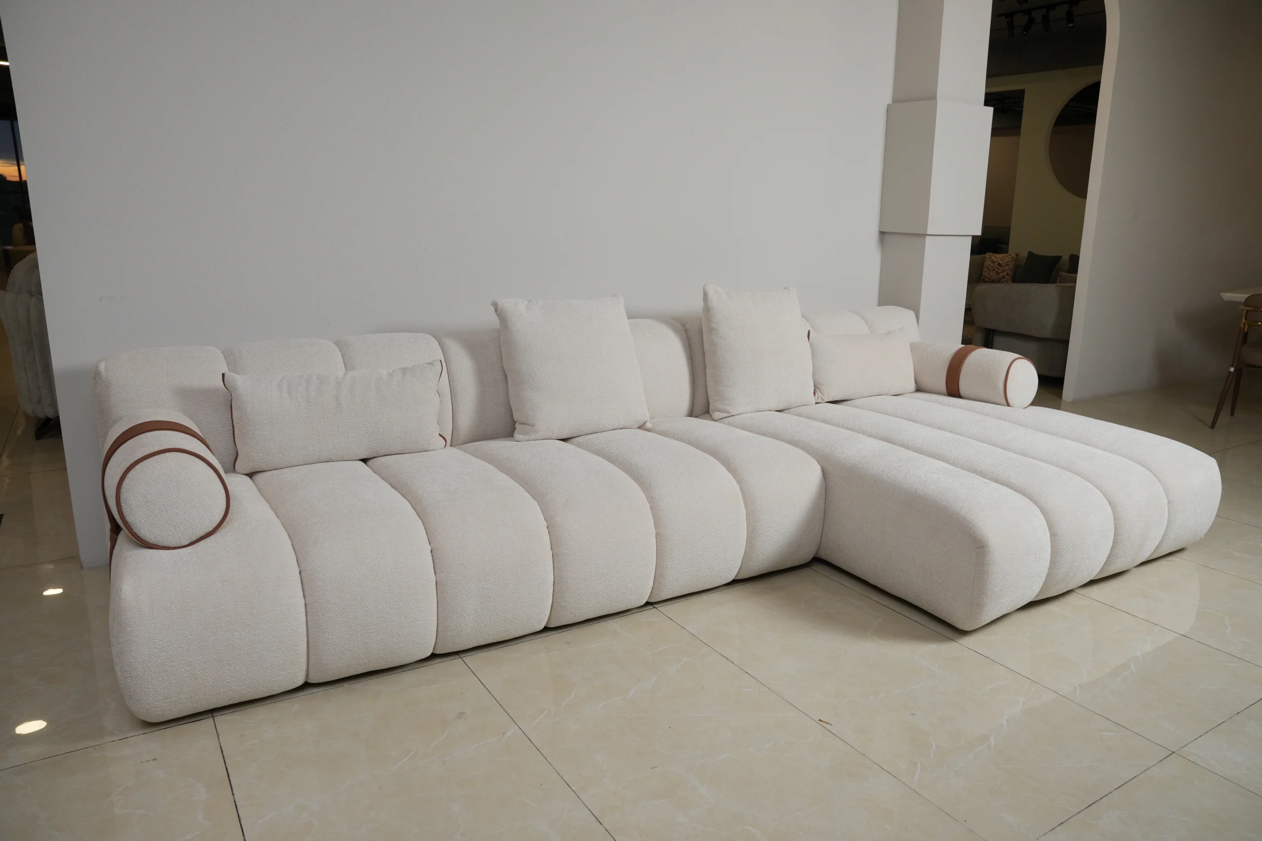 Elevate your living room with a sectional that blends plush contours, modern quilting, and a soft tonal palette. Perfect for spacious lounges, statement interiors, and relaxed everyday comfort.