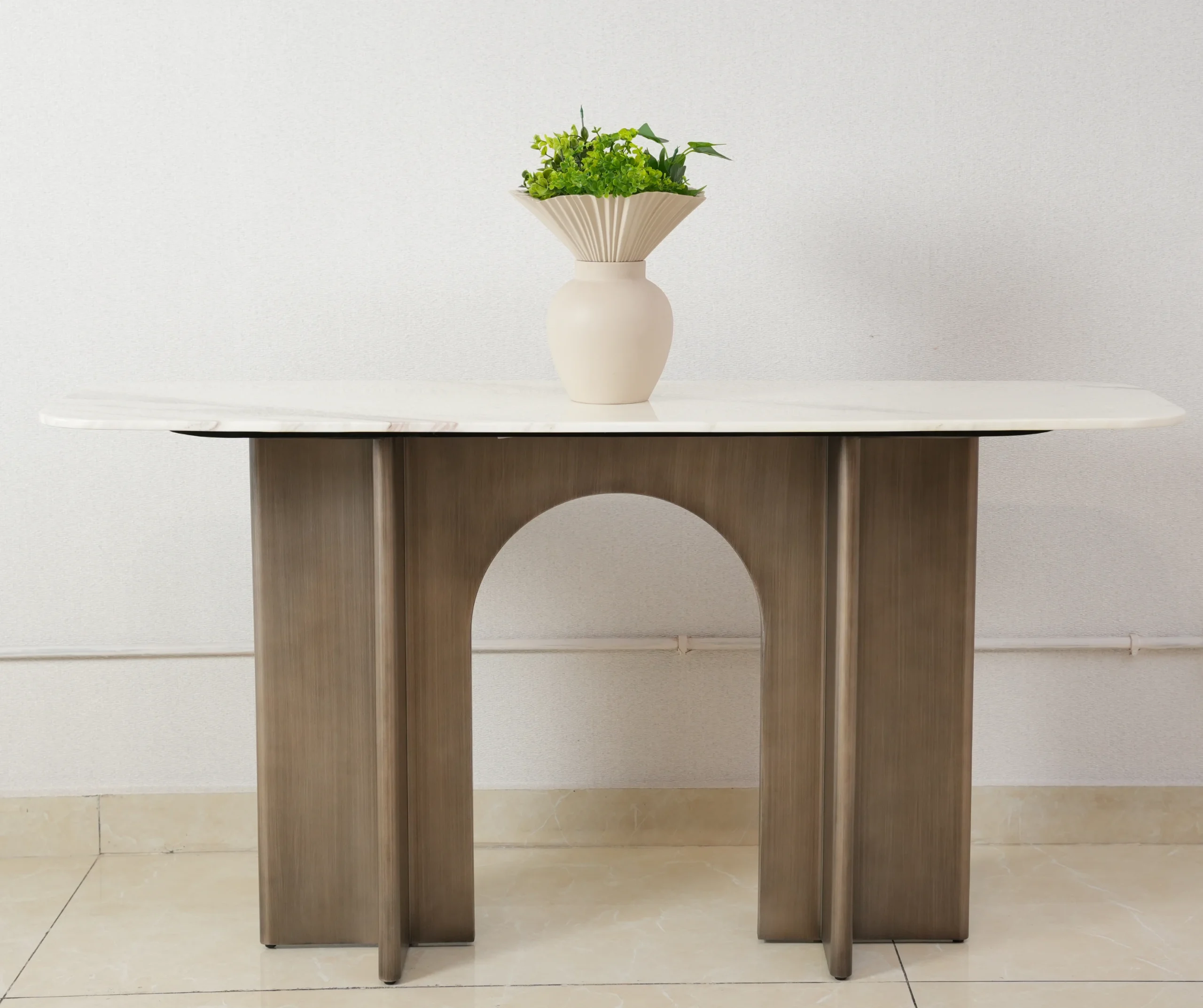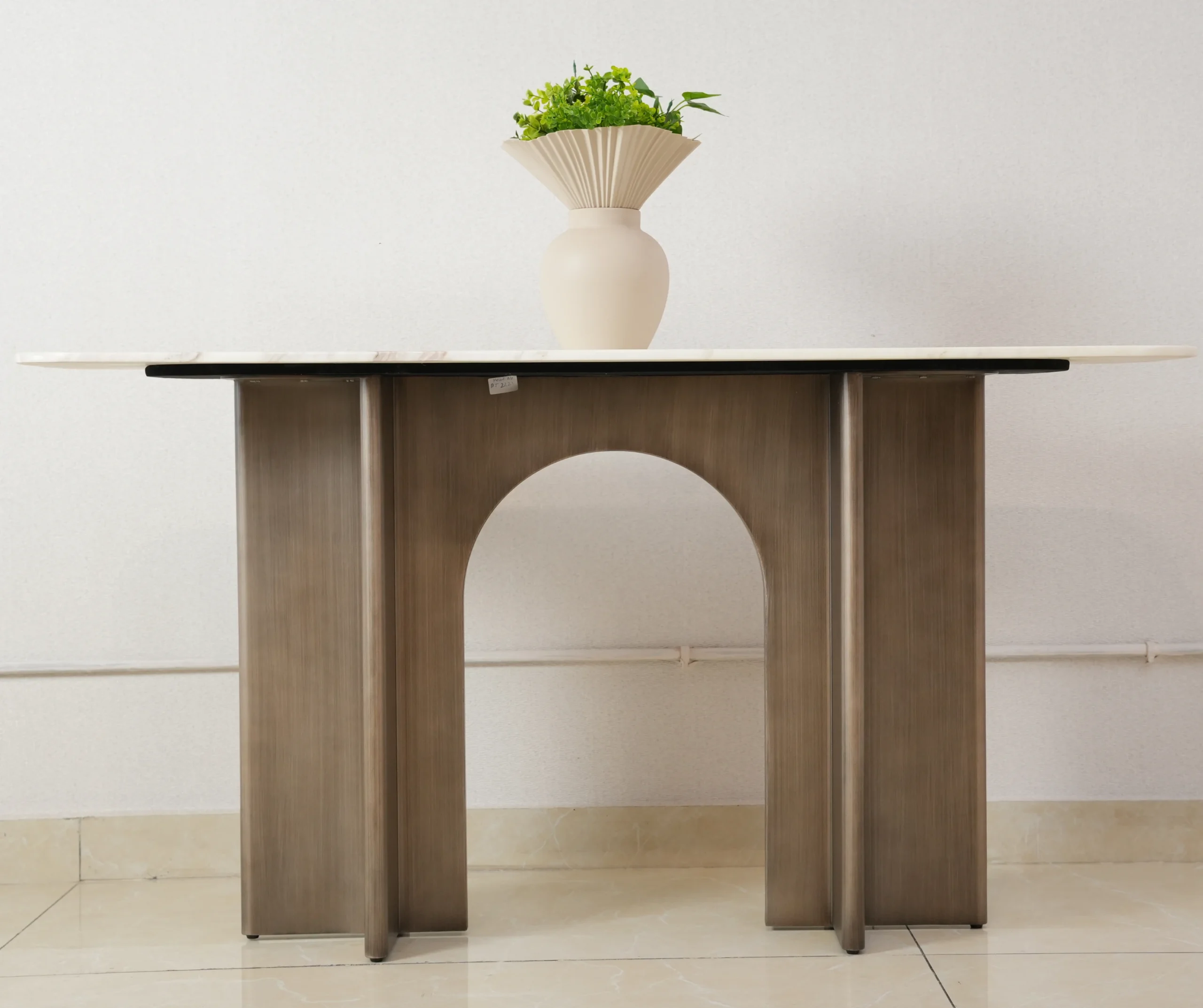 A modern console featuring a rounded stone top paired with a sculptural arched metal base — designed to bring architectural elegance, refined texture, and contemporary luxury to any interior.