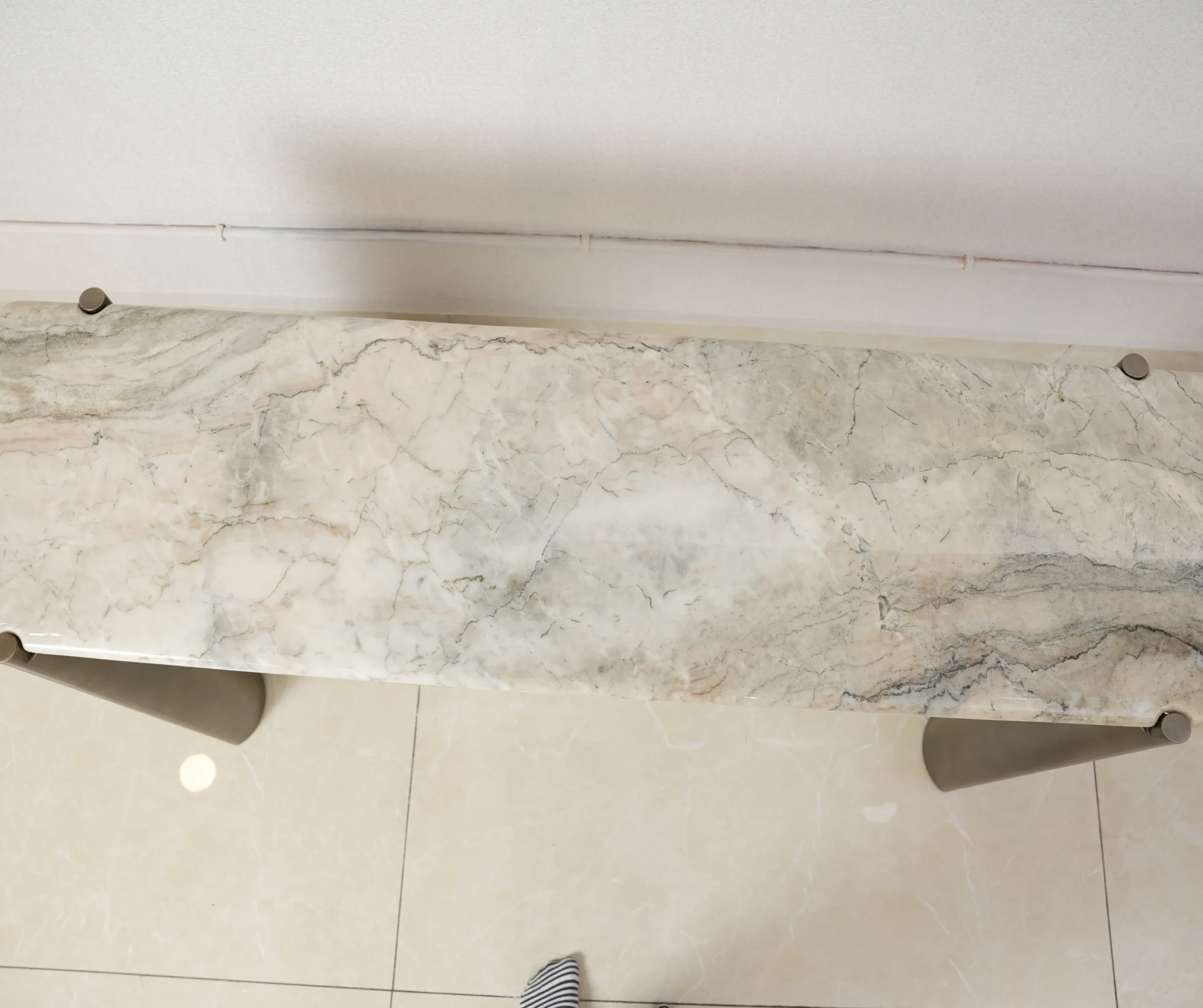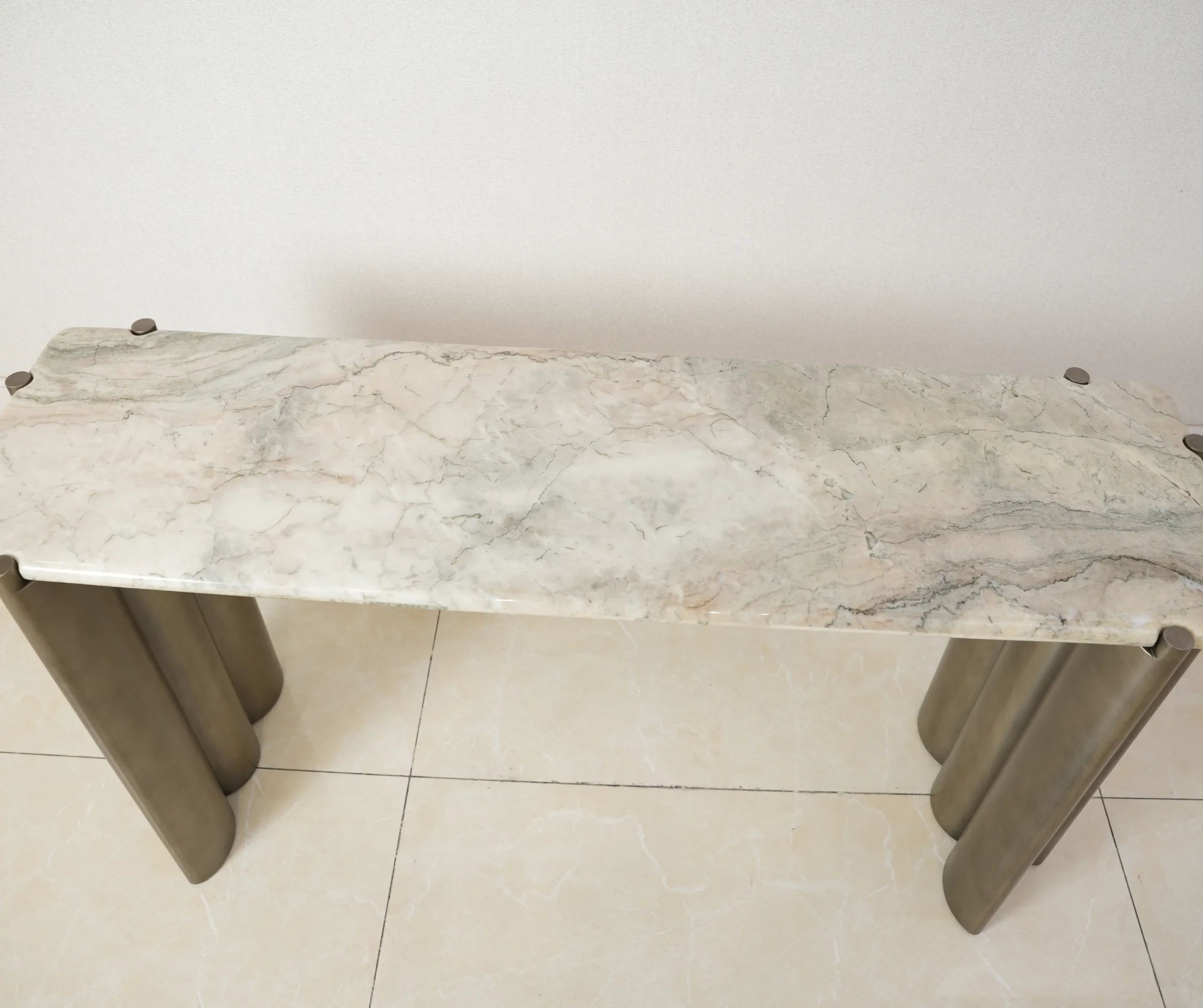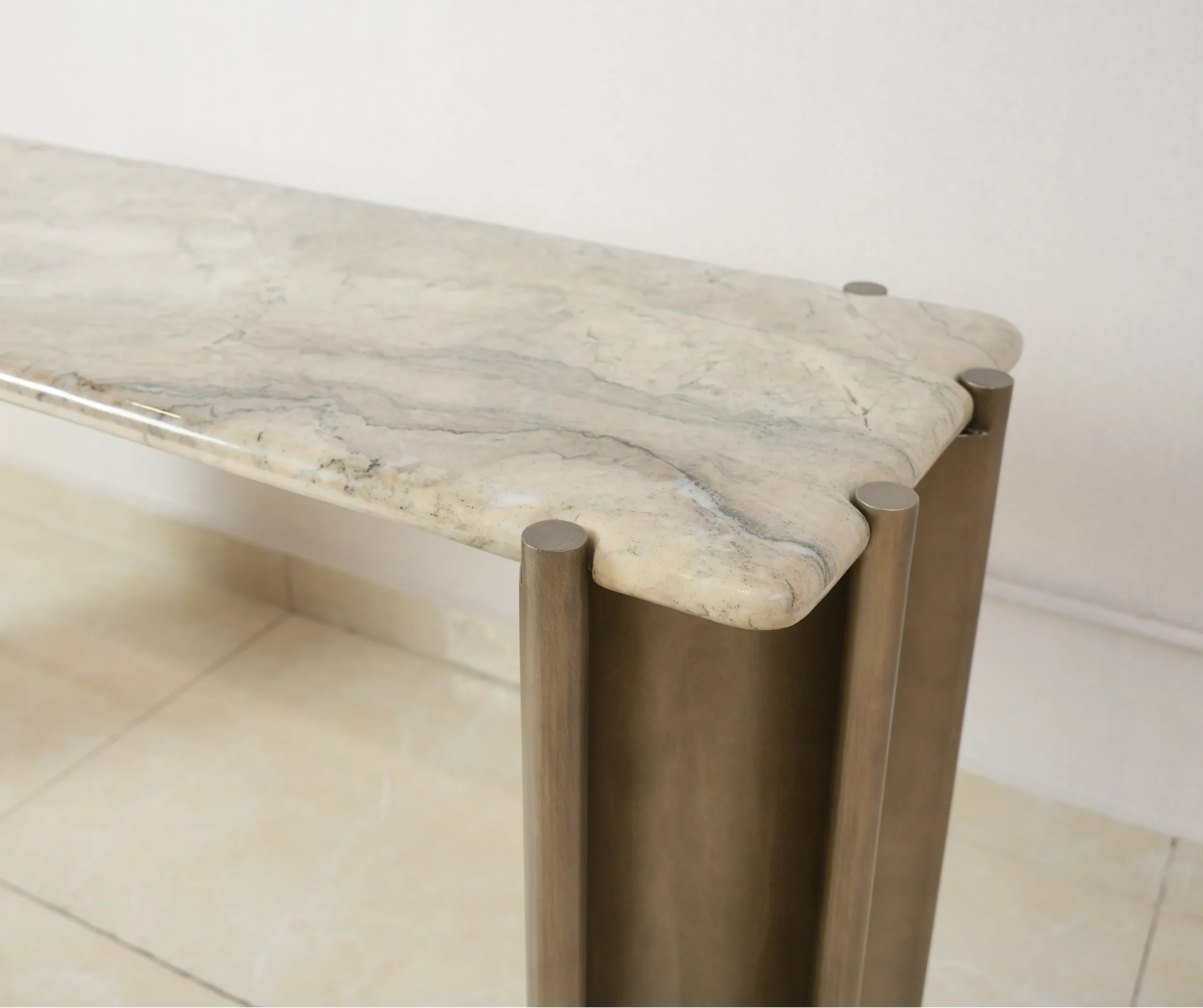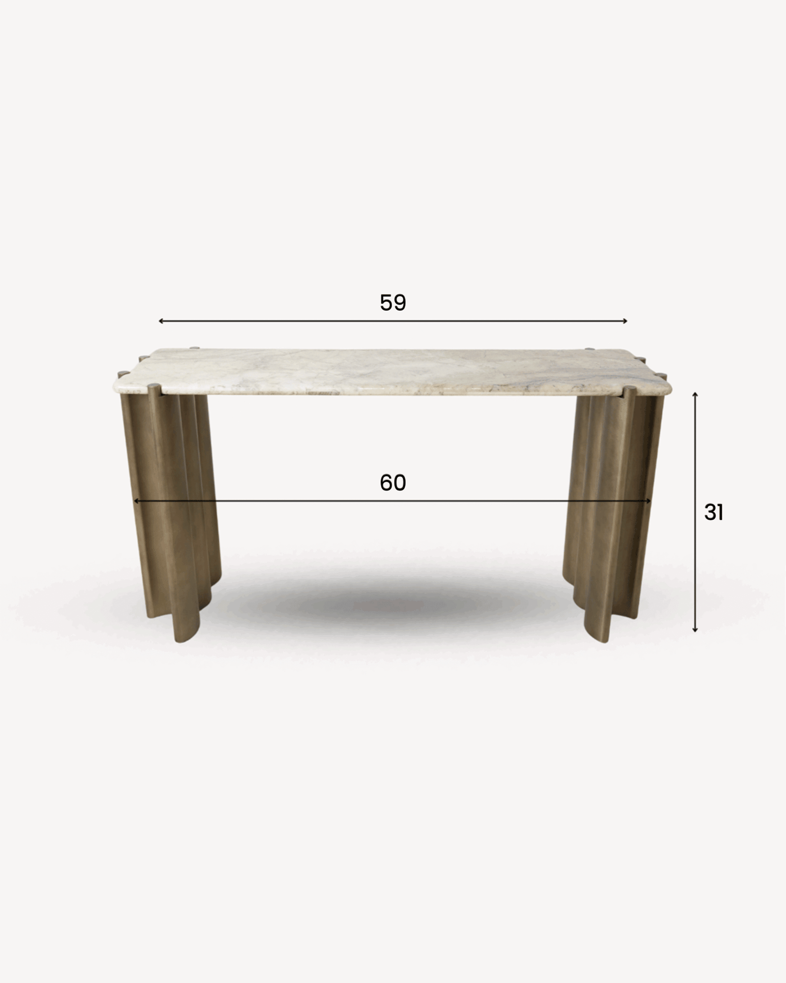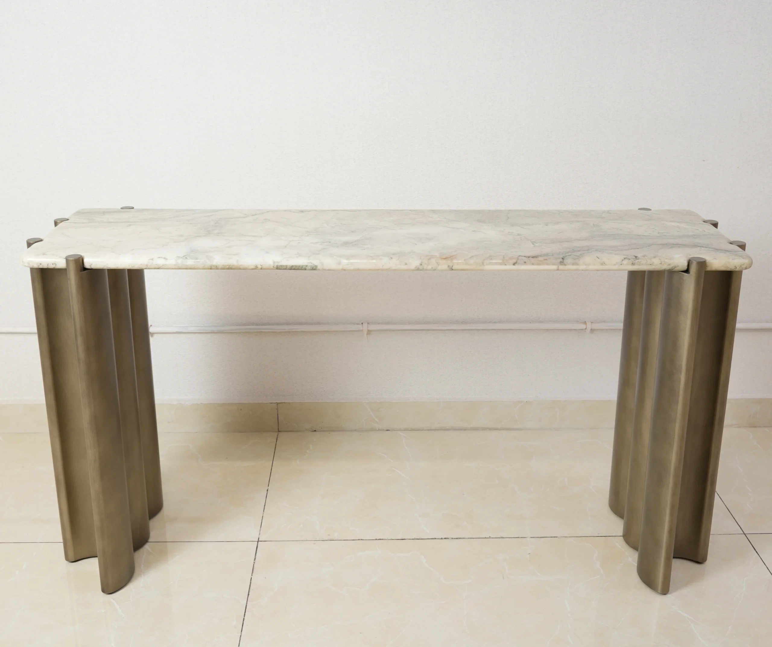 A refined marble console featuring sculpted fluted metal legs and a smooth stone top — designed to bring architectural elegance, modern texture, and luxurious presence to any interior.
