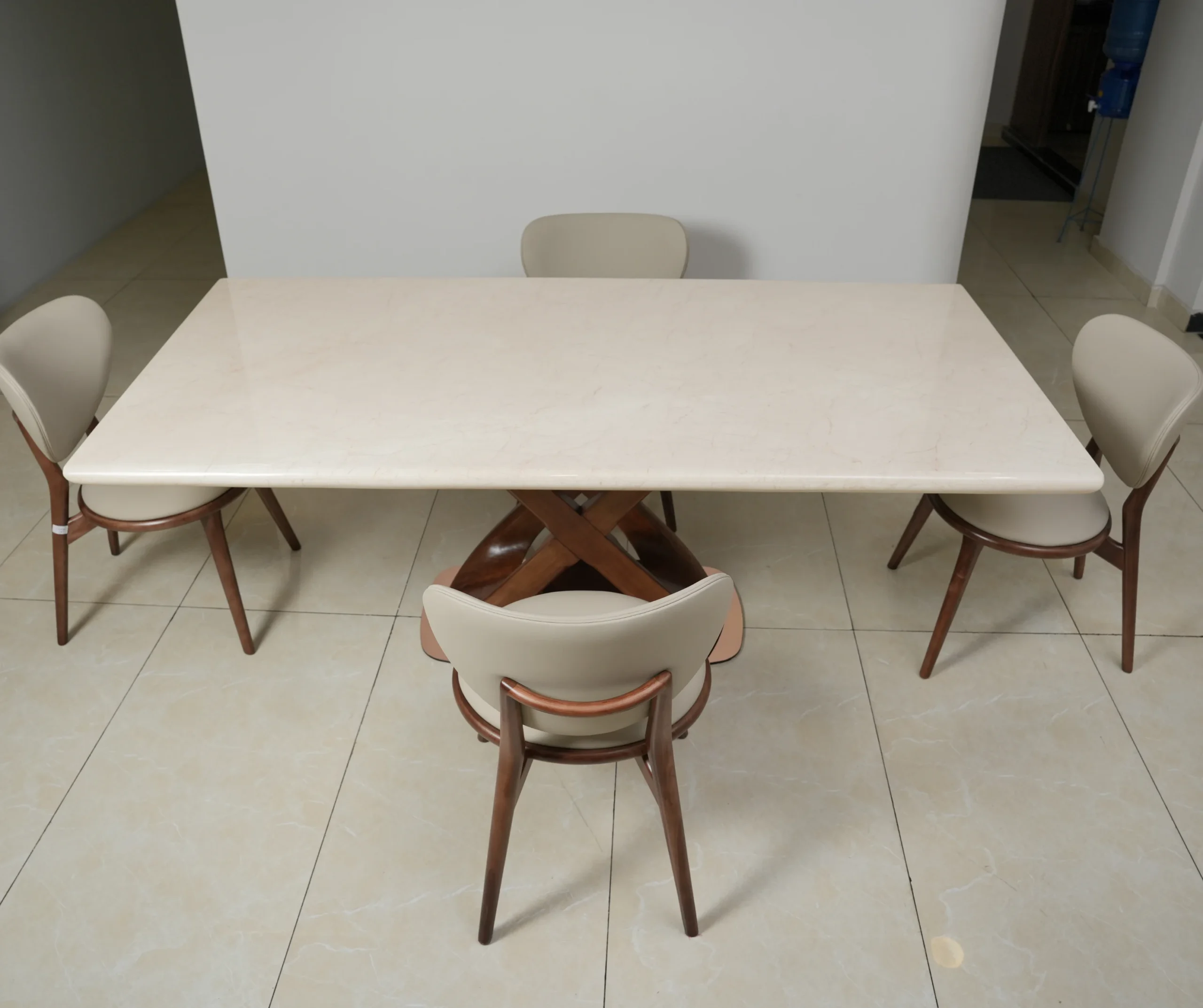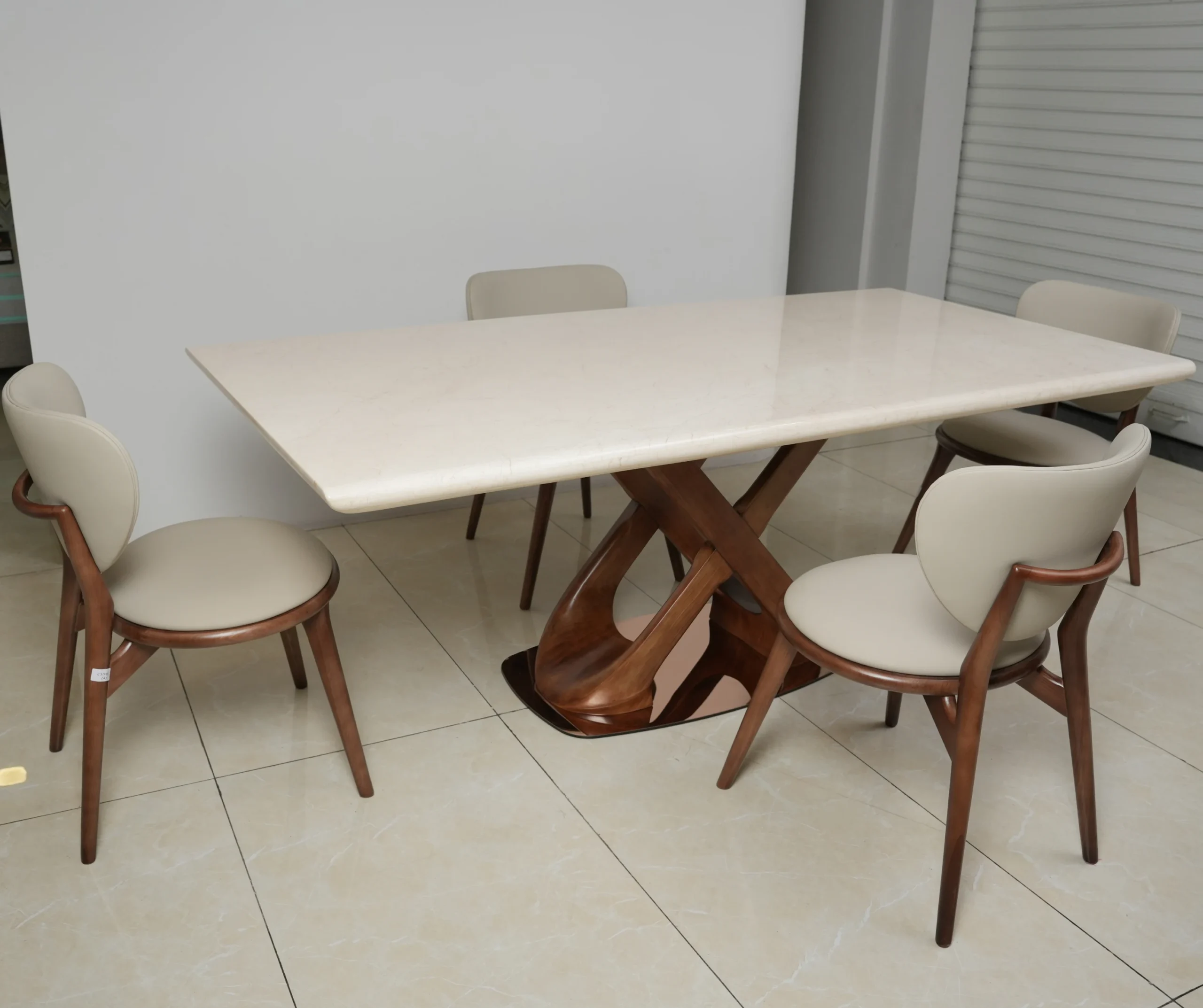 A refined dining set featuring a smooth polished tabletop paired with sculpted wooden chairs wrapped in soft upholstery — crafted to bring warm contemporary elegance and everyday comfort to your home.