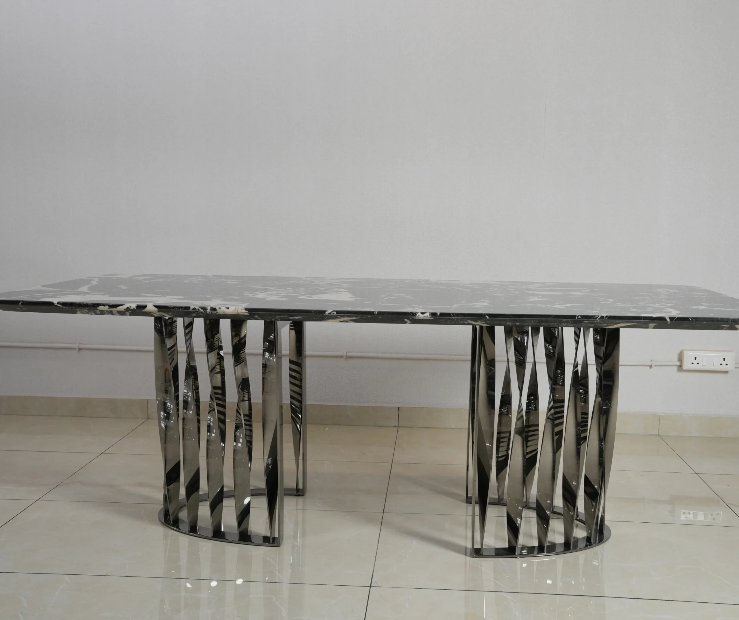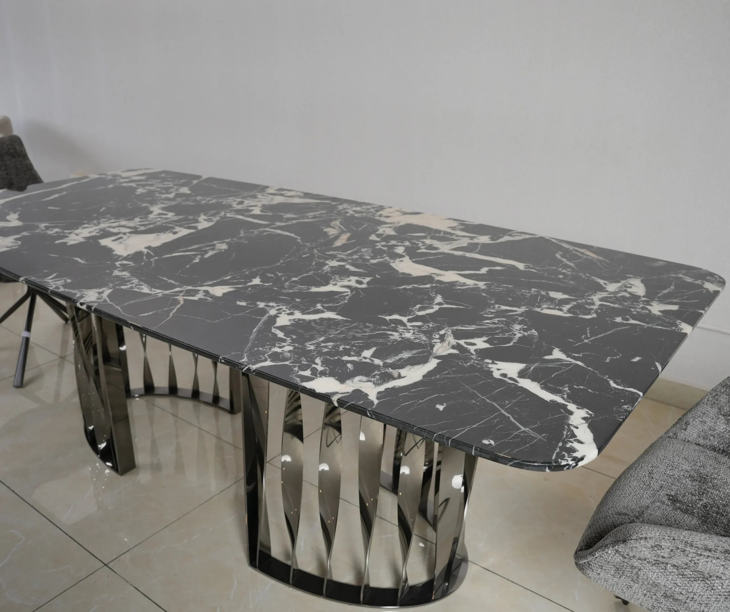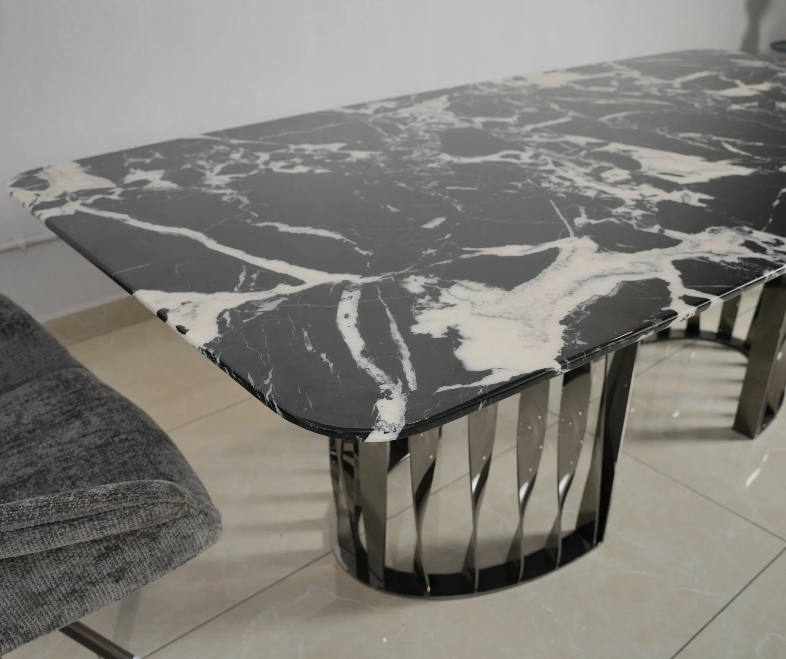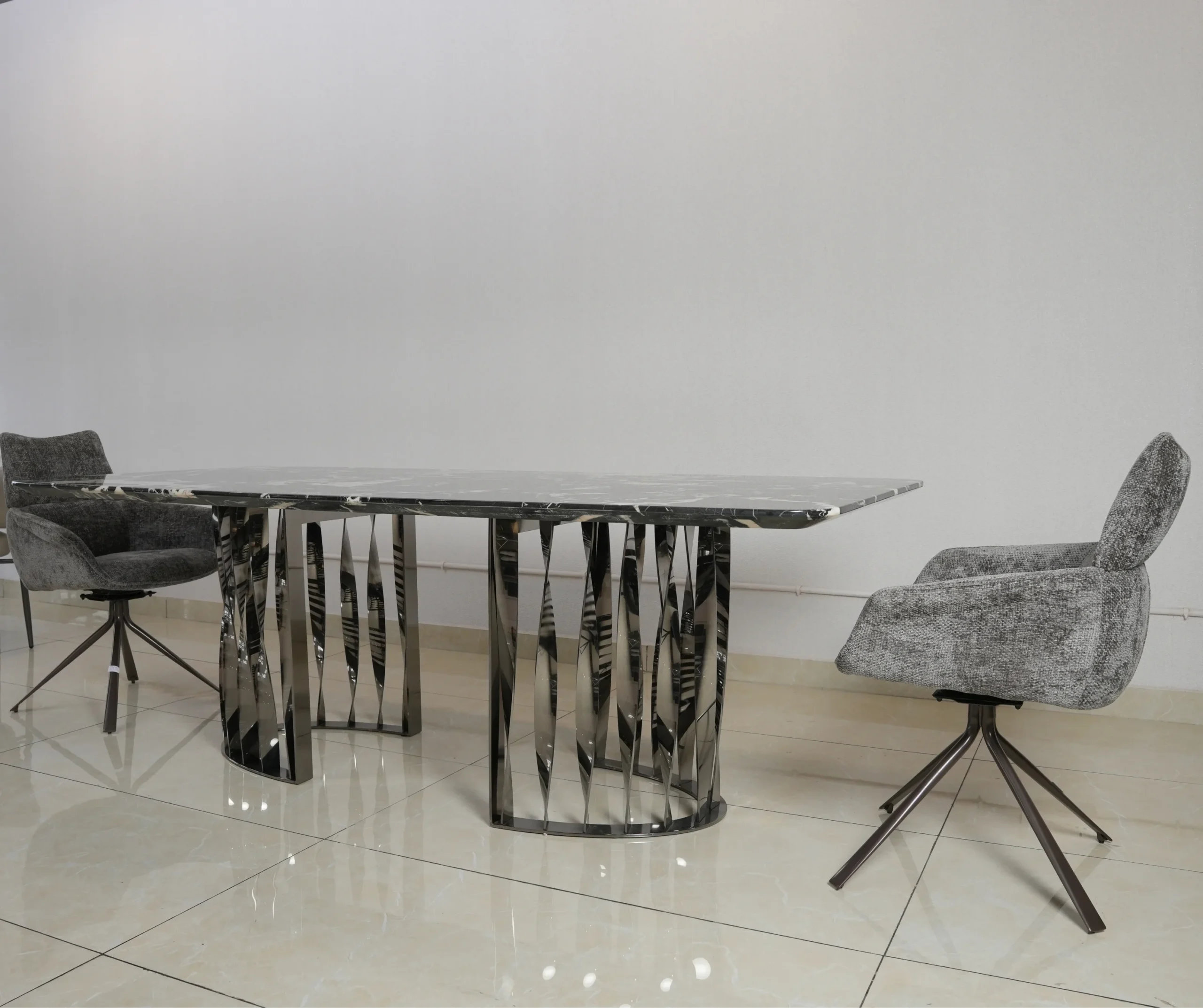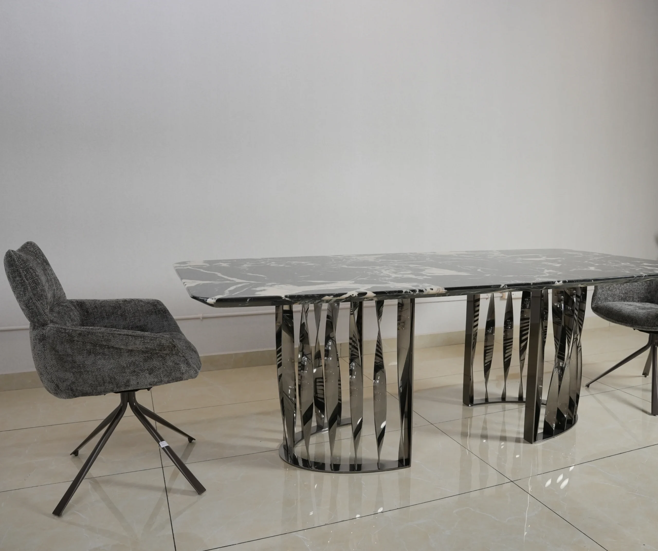 Refine your dining area with a set that blends expressive metal craftsmanship, rich stone textures, and ultra-comfortable contemporary seating. Perfect for homes seeking a dramatic, design-forward dining centerpiece.