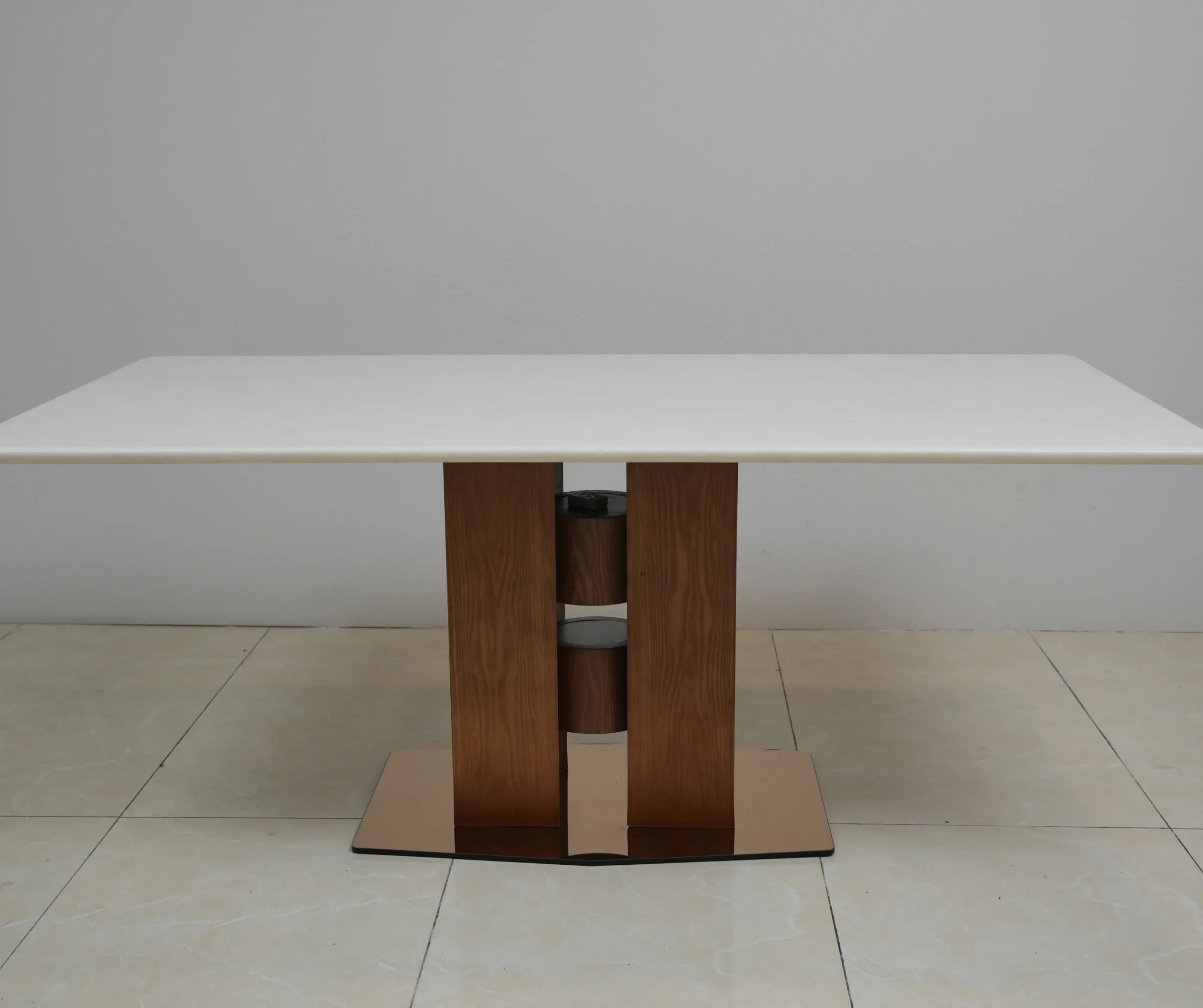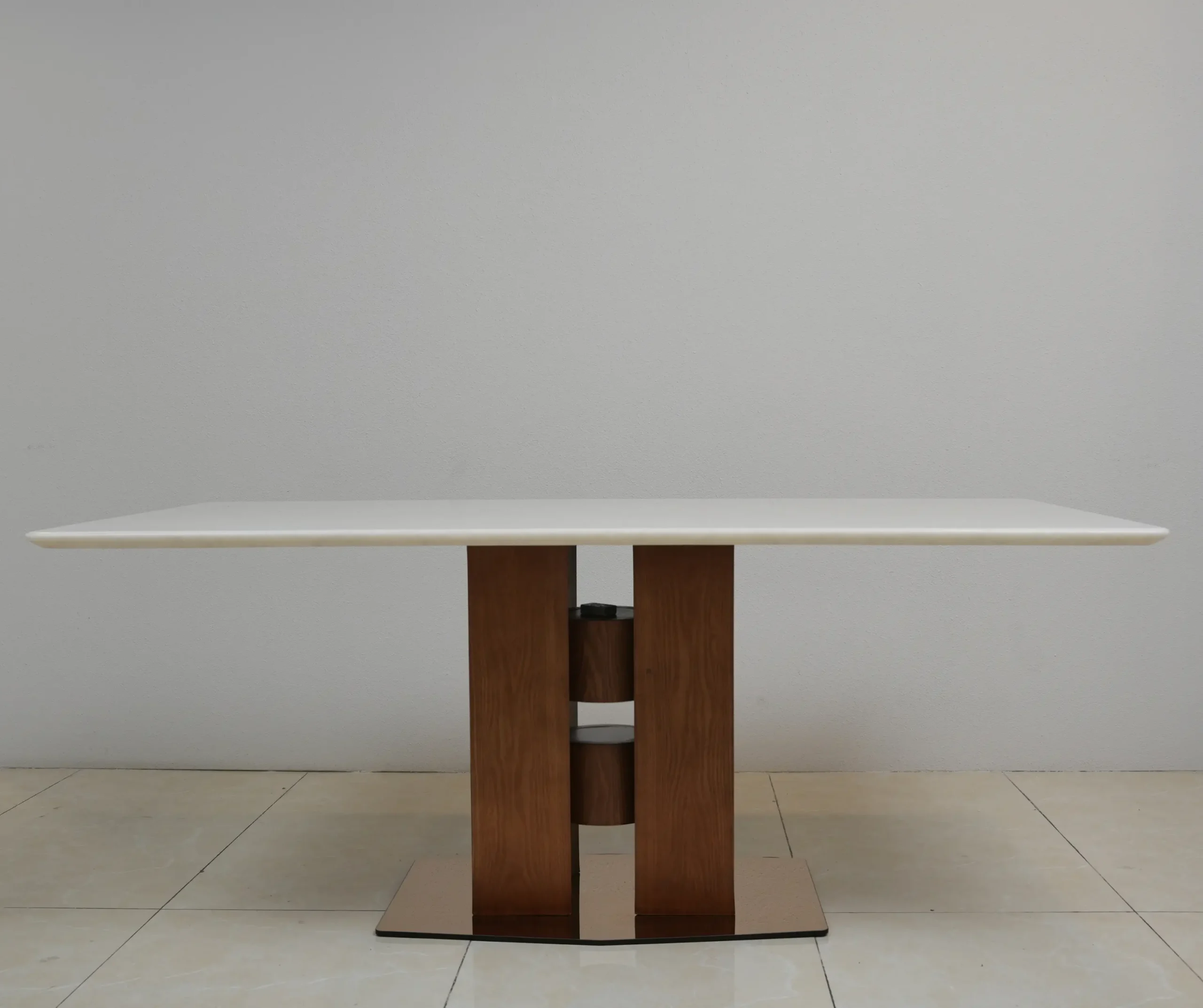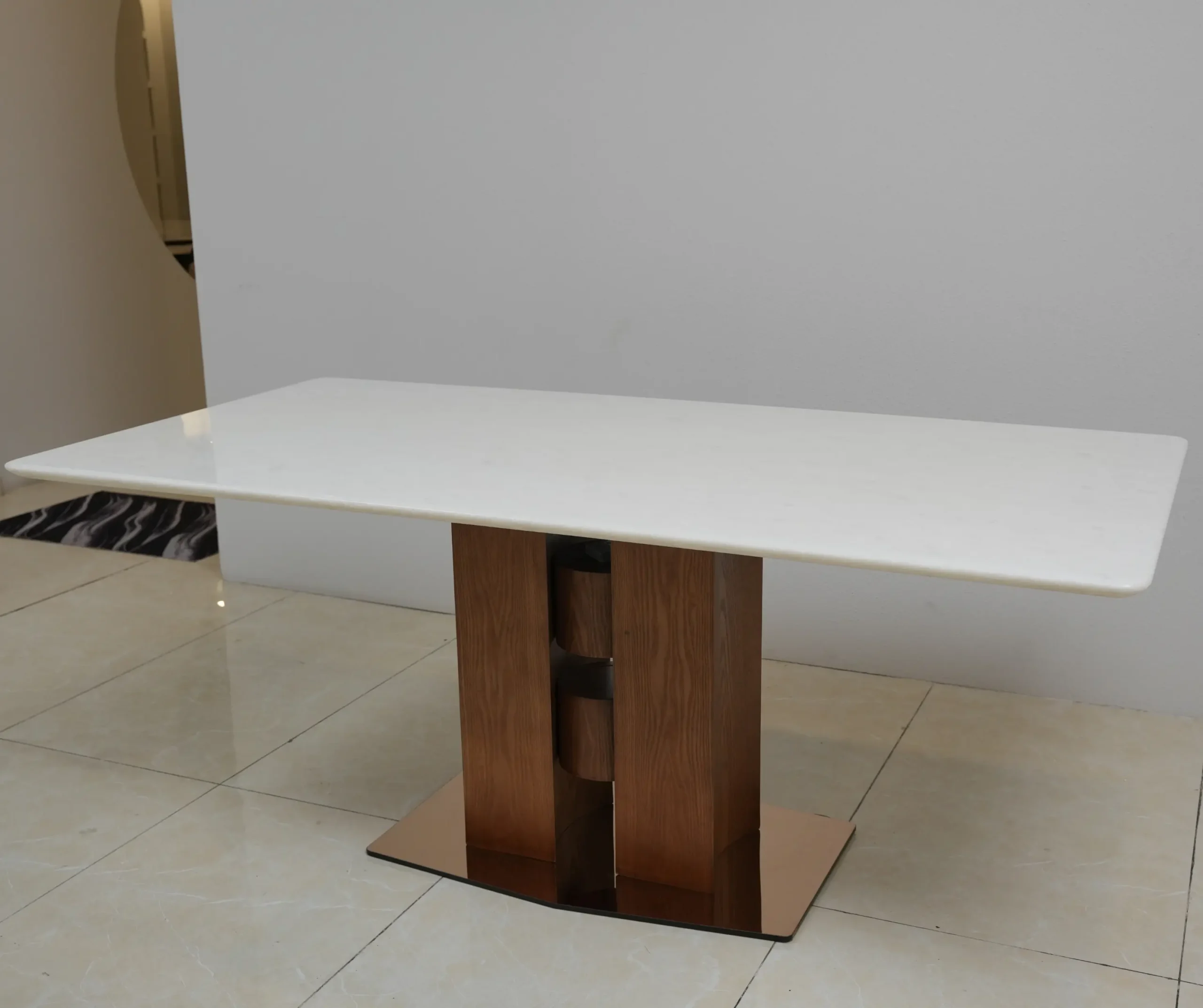 A refined dining table featuring a smooth white marble top and a sculpted wooden pedestal with a metallic base — designed to bring modern elegance, natural warmth, and luxurious simplicity to your dining space.